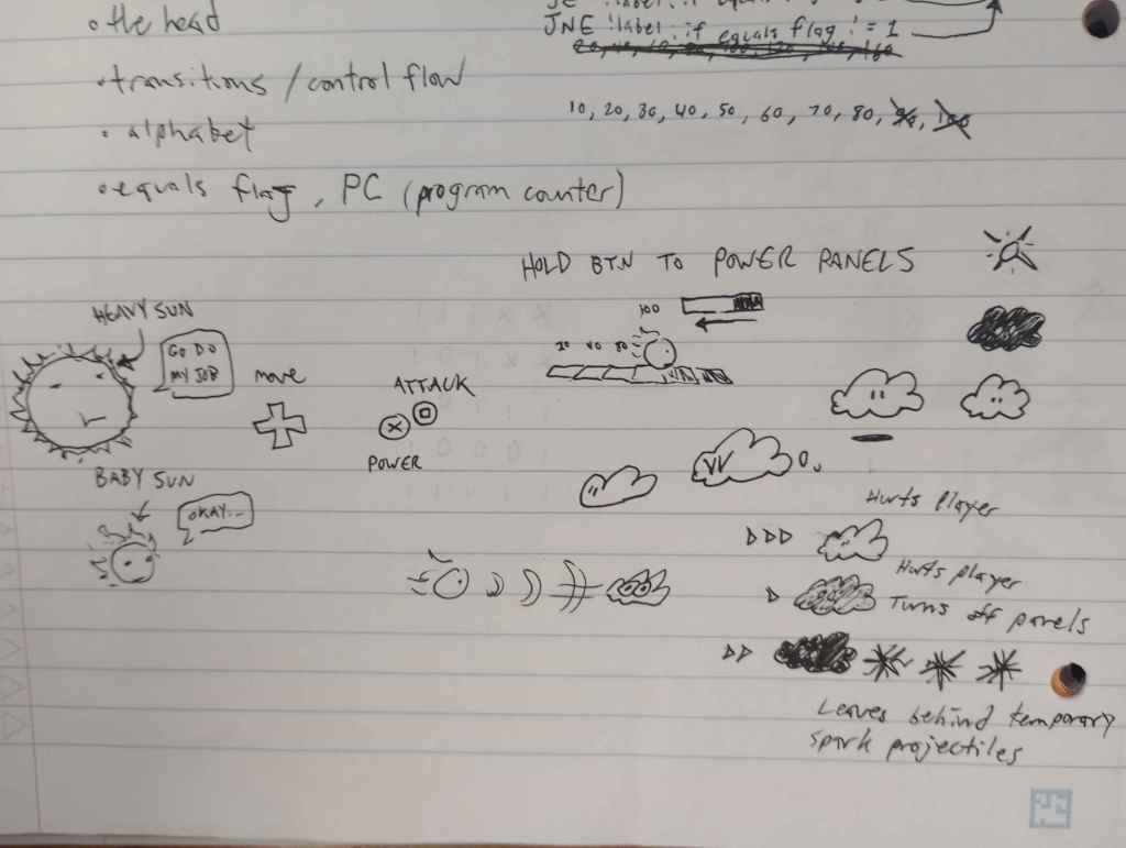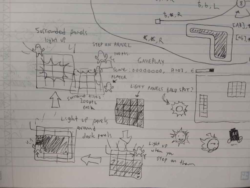 So I wanted to design a game around powering. I got to thinking about powering little machines that do this or that or fight enemies or something. That logic is just a bit too complicated for a short jam though. Eventually I figured out the idea of lighting panels! Here’s some doodles I did in class trying to figure things out.